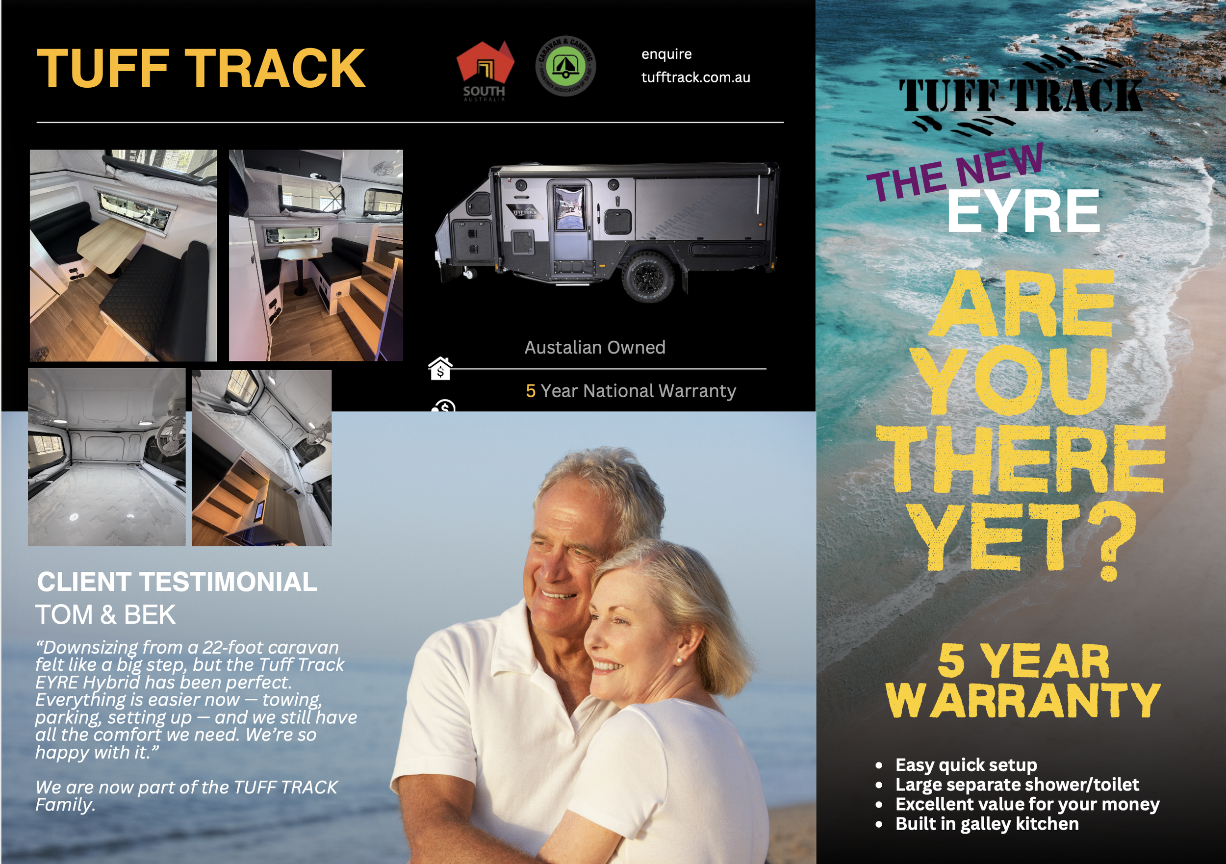 Born from the rugged beauty of the Eyre Peninsula and designed to sit perfectly between our Escape 13 and Outback 15, the all-new 14ft Tuff Track Eyre delivers the best of both worlds. It combines a low roof profile and lightweight, easy-tow design with the practicality of a full external galley kitchen and generous internal comforts — making it ideal for couples and young families who want serious off-road capability without stepping up in size.