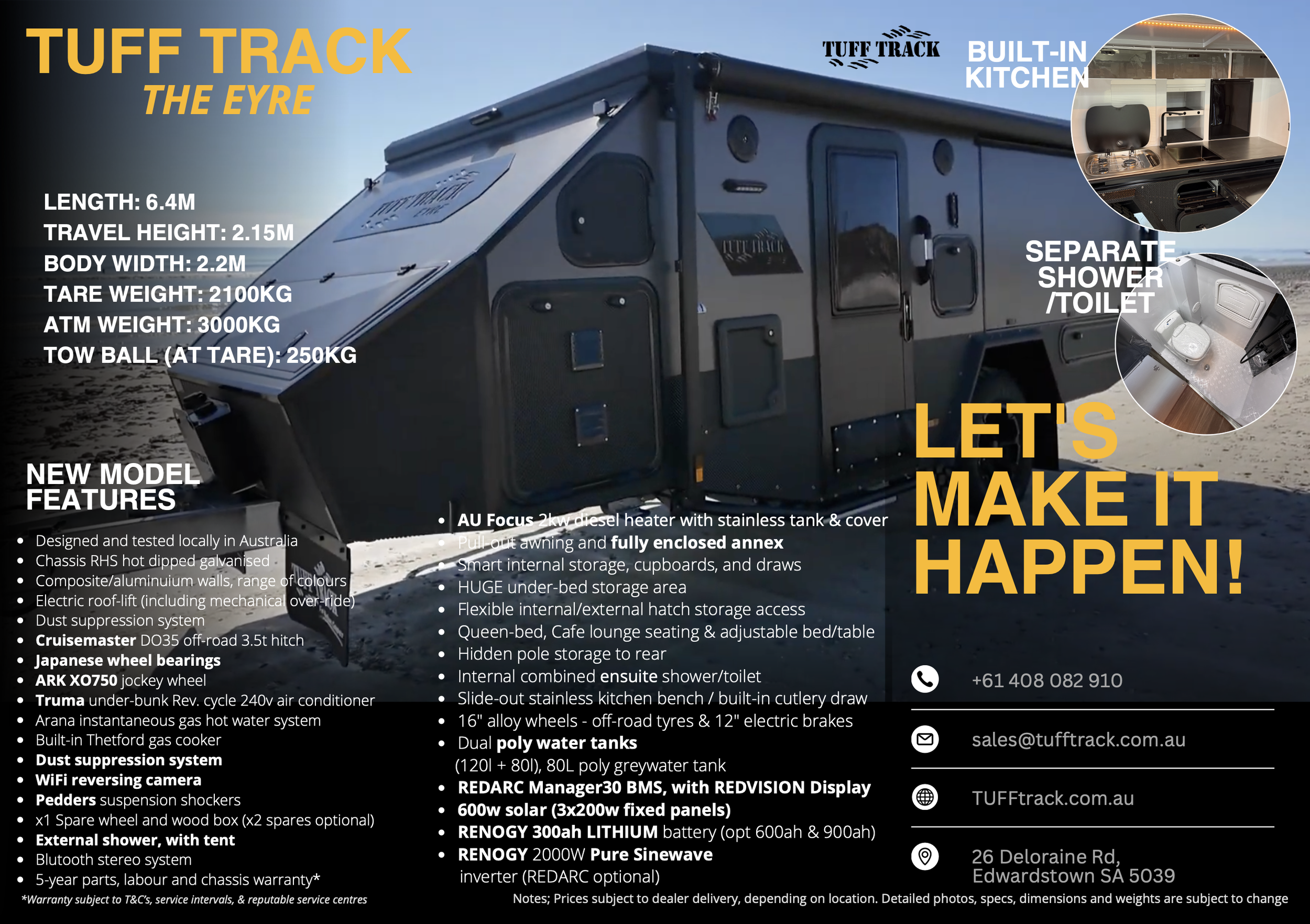 Meet the all-new 14ft Tuff Track Eyre — the perfect balance between compact agility and full-feature comfort. Designed for couples and young families who want serious off-road capability without stepping up to a larger van, the Eyre delivers a wider external galley kitchen, massive storage and premium off-grid systems in a low-profile, easy-to-tow package. It’s the best of the Escape and the Outback — refined, reimagined and ready for adventure.